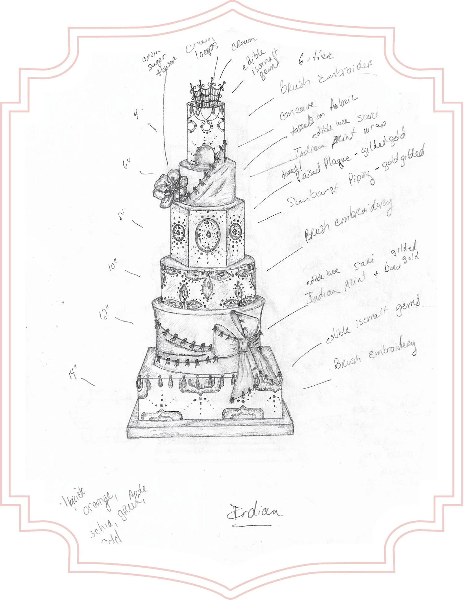 When you arrive, it’s helpful to have your color scheme, floral selection, and your venue decisions made and readily available to assist us in designing your cake. Please be sure to put your wedding inspiration elements together in a folder including photographs of your dress, invitations, color swatches, venue, and any special heirloom pieces that will help our collaborative design process. Once you book our services, a cake sketch will be provided to you and your fiancé. Feel free to make changes to your sketch to achieve your dream cake. Schedule your tasting- click here.