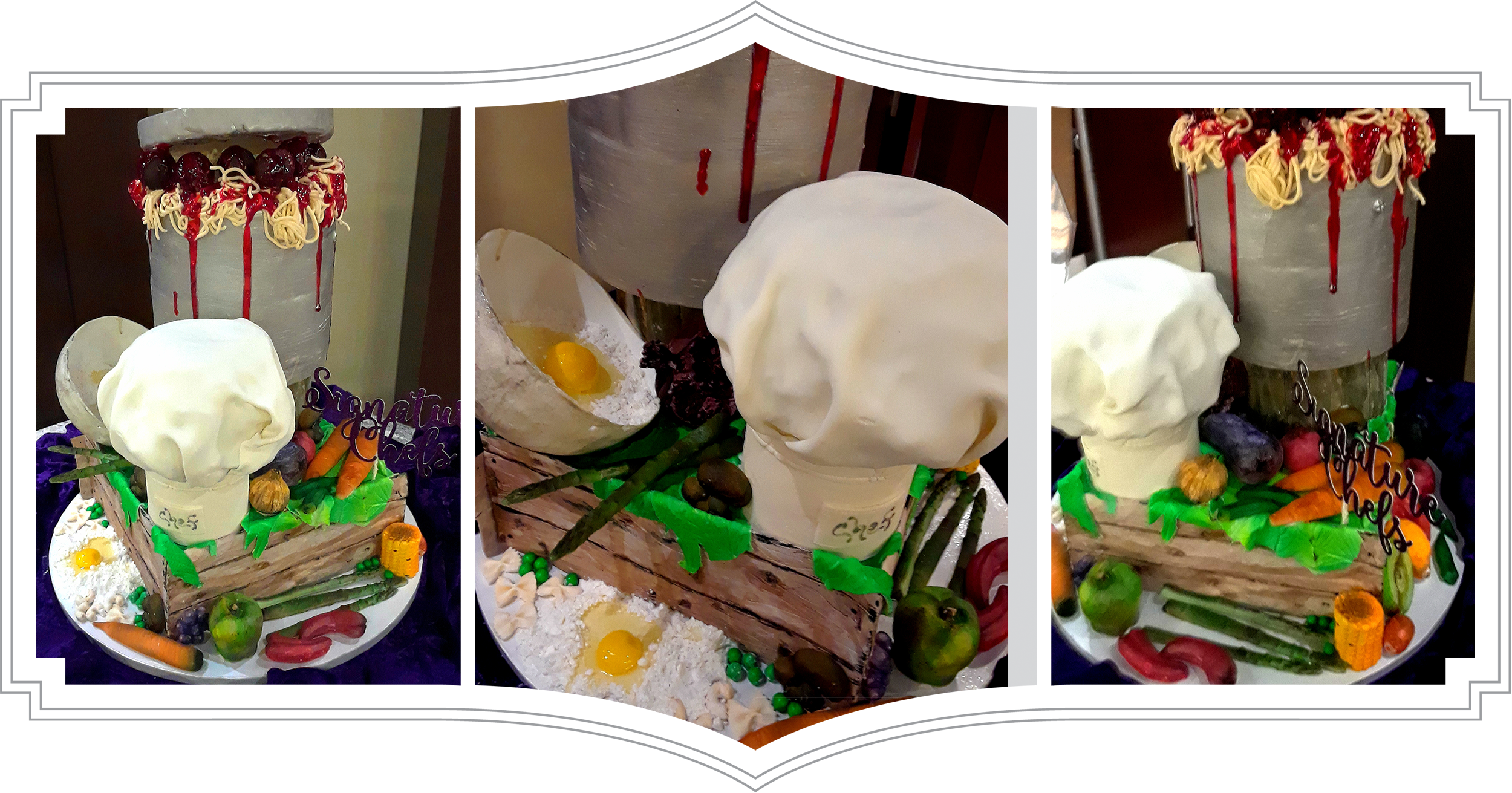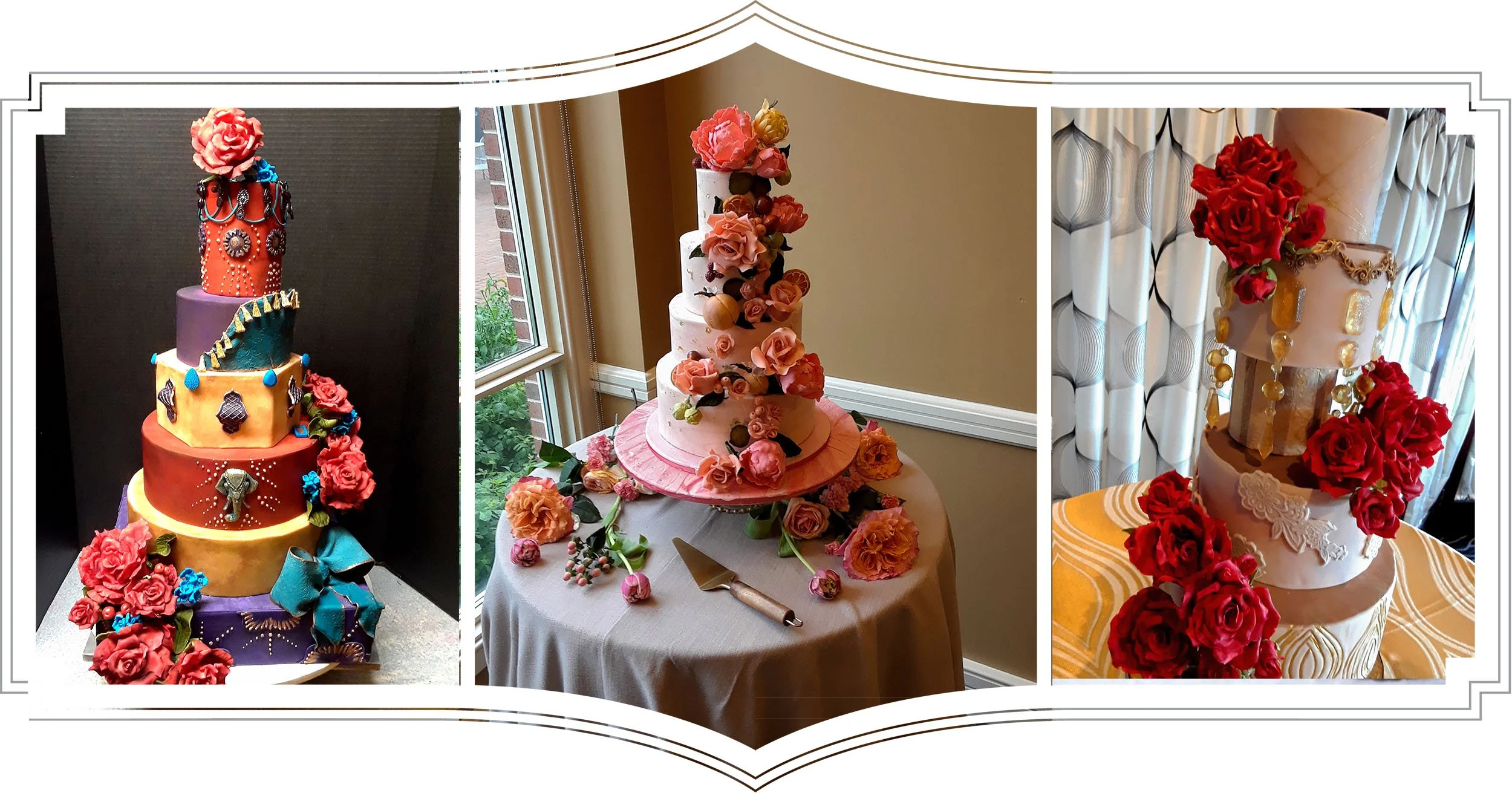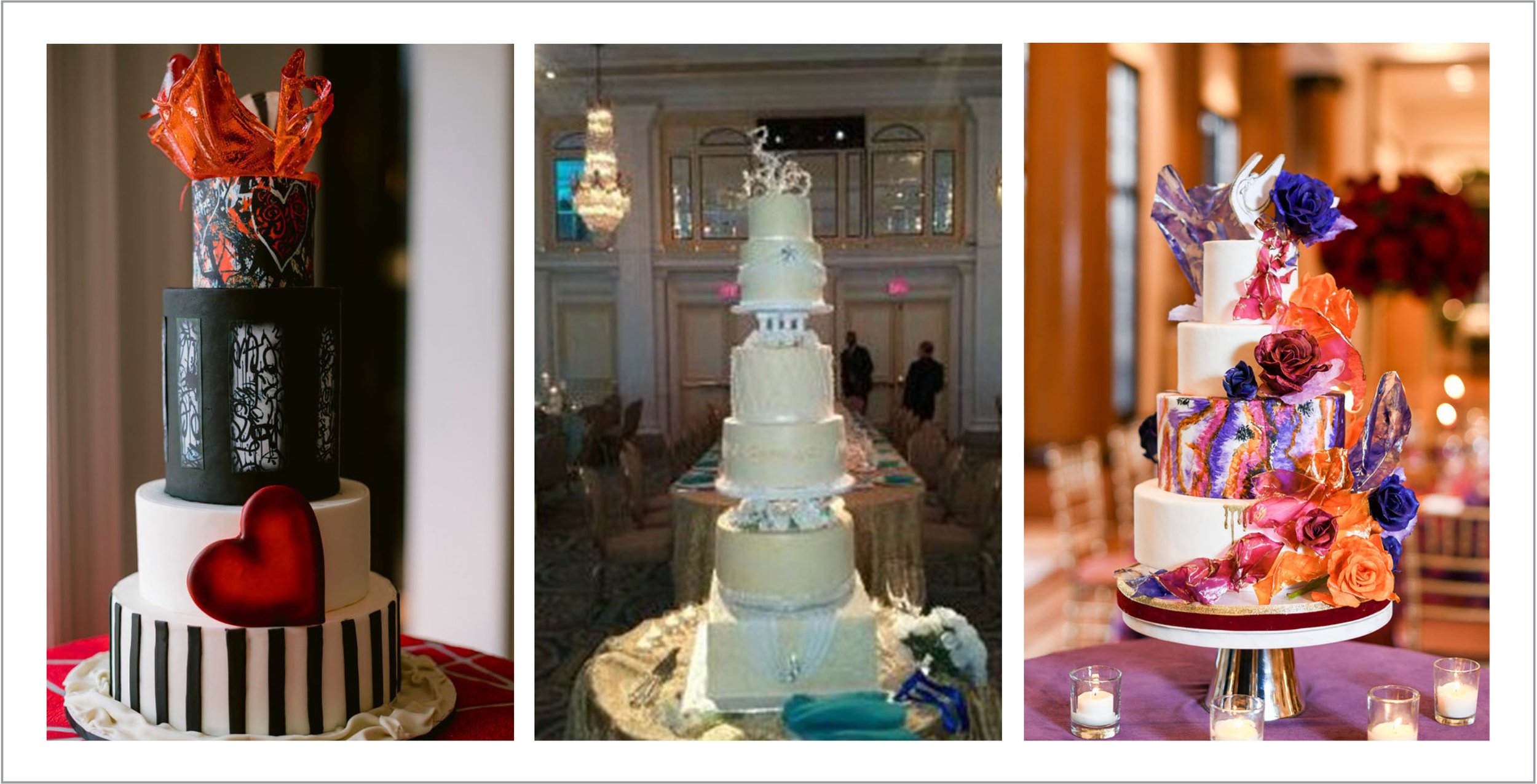 Our creative artistry begins with the baking. The most amazing tasting cake for your wedding is baked using strictly superior ingredients including European butter, fresh cracked eggs, sifted ingredients, whipped to perfection Italian meringue buttercream, tempered French chocolates, Madagascar vanilla, from-scratch curds, fillings, and fresh fruit preserves as well as our from-scratch white chocolate fondant.